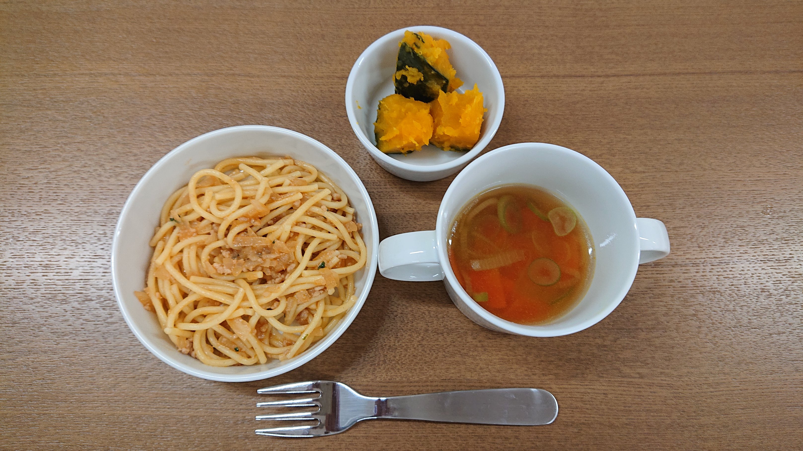 11:00 給食 管理栄養士が作成した献立と食材を配送してもらい、自園調理をしています! 毎日出来立ての美味しい給食を食べています!